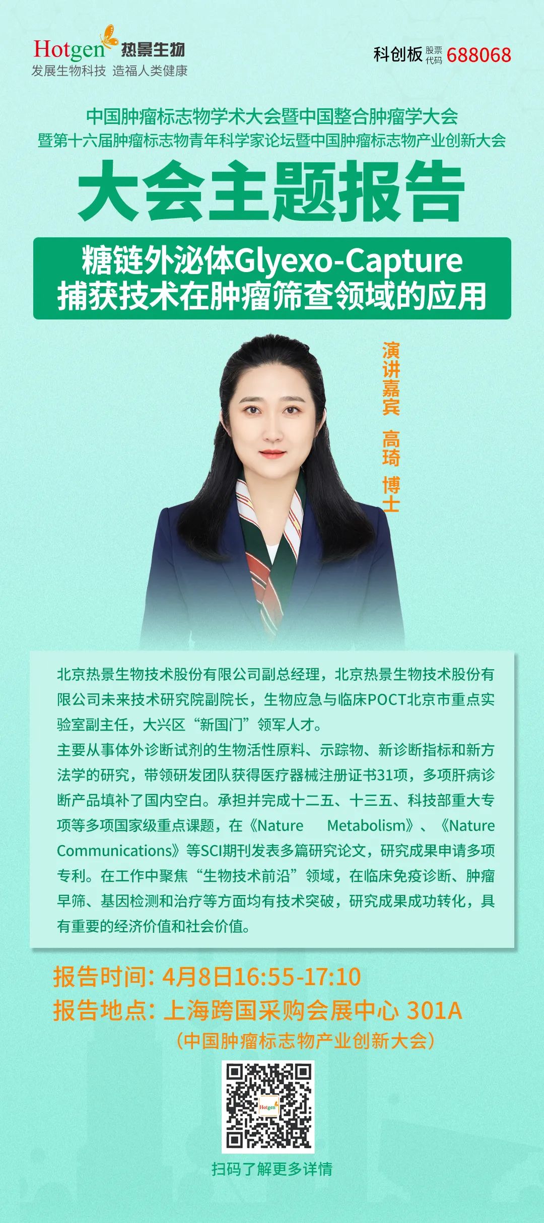 4月8日下午,北京熱景生物技術(shù)股份有限公司副總經(jīng)理,北京熱景生物未來技術(shù)研究院副院長(zhǎng)高琦博士受邀在中國(guó)腫瘤標(biāo)志物產(chǎn)業(yè)創(chuàng)新大會(huì)分享創(chuàng)新技術(shù)報(bào)告《糖鏈外泌體Glyexo-Capture捕獲技術(shù)在腫瘤篩查領(lǐng)域的應(yīng)用》。
