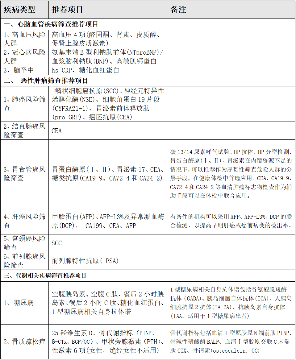 《健康體檢與管理》雜志編委會聯(lián)合北京醫(yī)學(xué)會健康管理學(xué)分會等學(xué)術(shù)組織,匯聚了全國健康體檢與管理機(jī)構(gòu)80余位知名專家的意見建議,制定了成人個體化健康體檢基本項目和常見慢性病篩查體檢項目的推薦清單,形成《成人個體化健康體檢項目推薦專家共識》,已于近期發(fā)布。針對常見病和慢性病的健康體檢項目推薦清單,熱景生物多個項目獲得推薦(表1)。