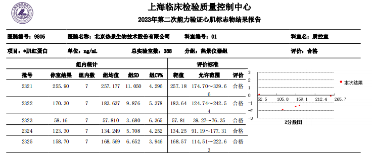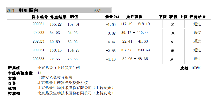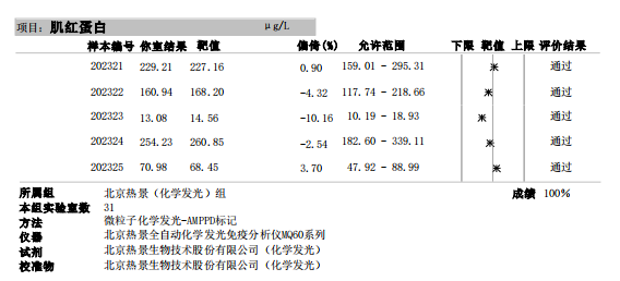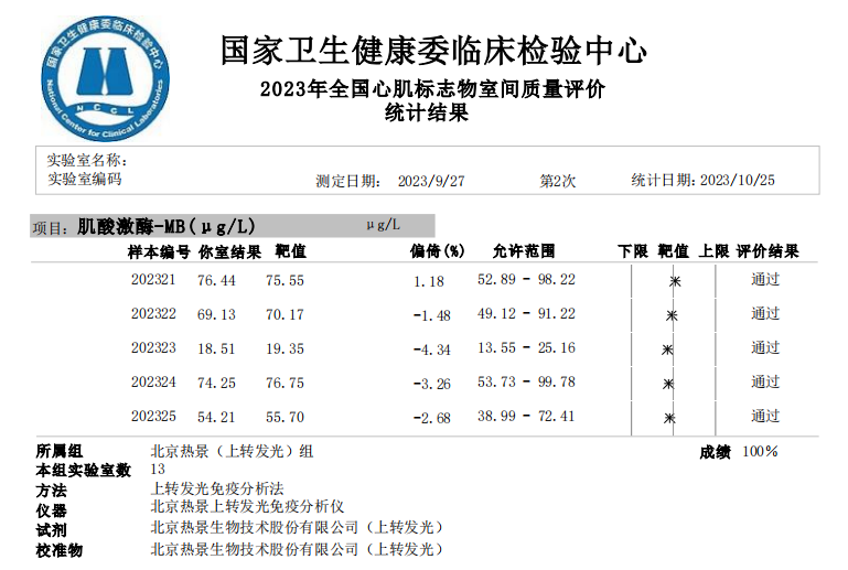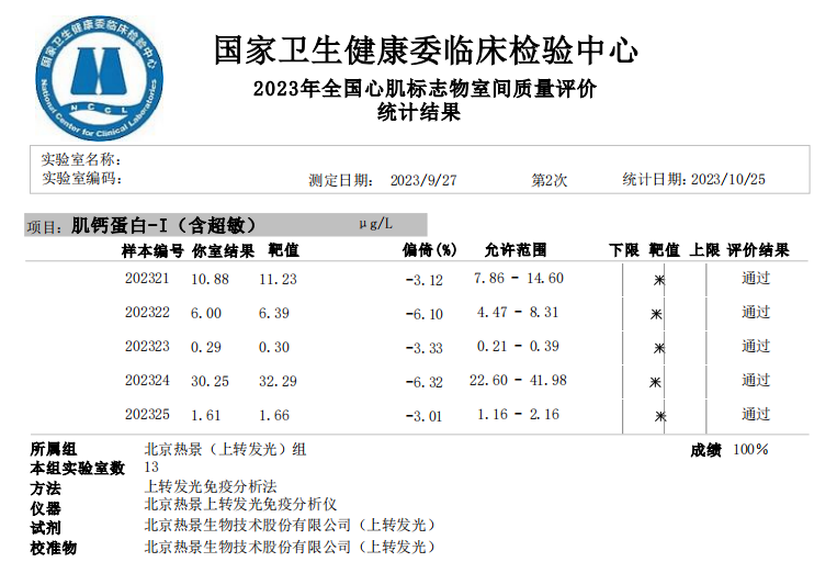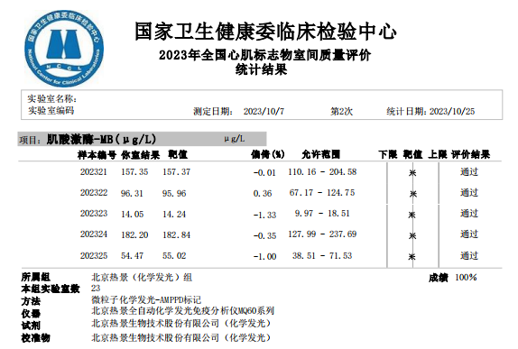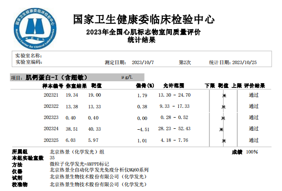 近日,國家衛(wèi)生健康委臨床檢驗中心(NCCL)公布了2023年第二次全國臨床檢驗室間質(zhì)量評價結(jié)果。經(jīng)了解,熱景生物心肌標(biāo)志物(肌酸激酶同工酶、肌紅蛋白、肌鈣蛋白I)、血清降鈣素原項目的上轉(zhuǎn)發(fā)光及化學(xué)發(fā)光兩大平臺產(chǎn)品,以及D-二聚體、白介素6、胃蛋白酶原項目的化學(xué)發(fā)光平臺產(chǎn)品均滿分通過此次室間質(zhì)量評價。同時,熱景生物參與的上海臨床檢驗中心2023年第二次能力驗證活動,包括AFP異質(zhì)體比率、B型鈉尿肽/N末端B型鈉尿肽前體、心肌標(biāo)志物(肌酸激酶同工酶、肌紅蛋白、肌鈣蛋白I)、血清降鈣素原等項目在內(nèi)的產(chǎn)品均通過評價。