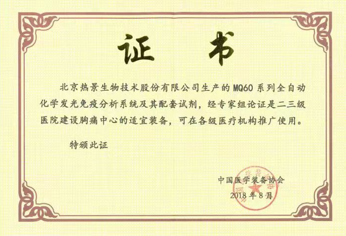 早在2018年,MQ60系列全自動化學(xué)發(fā)光免疫分析系統(tǒng)及其配套試劑通過中國醫(yī)學(xué)裝備協(xié)會組織國內(nèi)檢驗、心內(nèi)和急診等領(lǐng)域知名專家技術(shù)論證,一致認(rèn)為該設(shè)備滿足急診對高質(zhì)量檢測結(jié)果的要求,性能穩(wěn)定可靠,操作簡單快速,符合質(zhì)控要求,不依賴其它設(shè)備或繁瑣前處理,可對各類樣品進(jìn)行檢測,滿足二三級醫(yī)院建設(shè)胸痛中心的要求,適合各級醫(yī)療機構(gòu)推廣應(yīng)用。