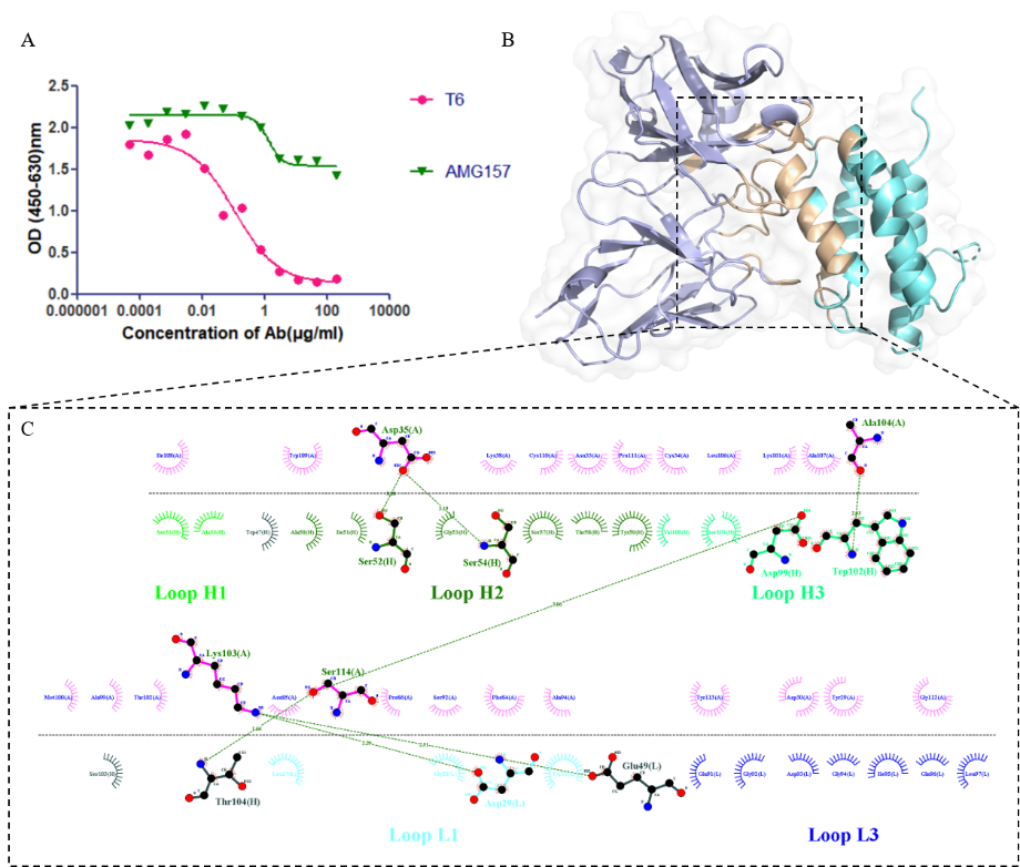 圖1:TSLP-T6復(fù)合物結(jié)構(gòu)分析。(A) ELISA實驗測定AMG157與T6抗體的結(jié)合表位;(B) TSLP-T6復(fù)合物結(jié)構(gòu);(C) TSLP-T6作用力分析