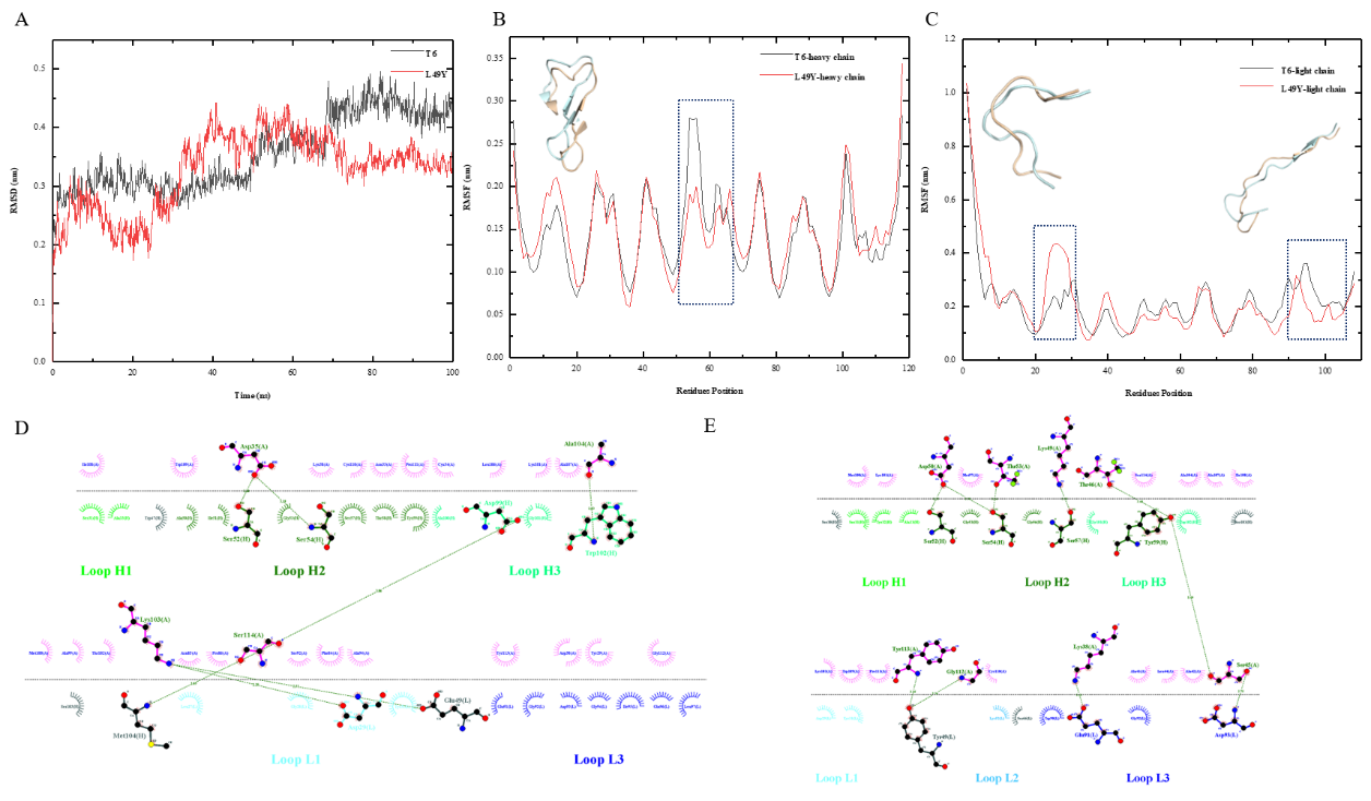 圖2:L49Y動力學(xué)模擬分析圖。(A) L49Y模擬過程RMSD圖;(B) L49Y重鏈模擬RMSF圖;(C) L49Y輕鏈模擬RMSF圖;(D) T6-TSLP相互作用分析圖;(E) L49Y-TSLP相互作用分析圖