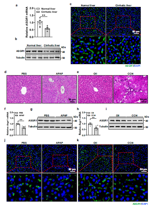 a、b 正常和肝硬化人肝組織中脫唾液酸糖蛋白受體 1 (ASGR1) 的相對 mRNA 和蛋白表達(每組 n = 6)。c 正常和肝硬化人肝組織中 ASGR1 的免疫熒光染色。d – k 8周齡小鼠腹腔注射對乙酰氨基酚(APAP,400 mg/kg體重,單劑量)以誘導(dǎo)急性肝損傷,PBS作為對照治療,或四氯化碳(CCl4,1 ml/kg)身體體重,每周兩次,持續(xù) 6 周),以油作為對照治療誘導(dǎo)慢性肝損傷(每組 n = 6)。d、e 肝切片的 H&E 染色。f – i 用 APAP 或 CCl4 處理的小鼠中肝臟 ASGR1 的相對 mRNA 和蛋白質(zhì)表達。j、k 用 APAP 或 CCl4 處理的小鼠肝臟中ASGR1 的代表性免疫熒光染色。