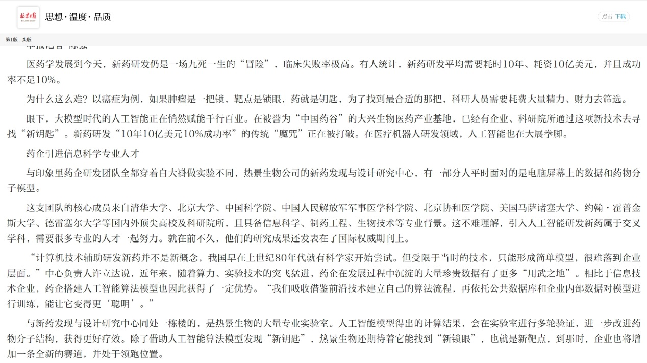 近期,人民日報(bào)、新華社、經(jīng)濟(jì)日報(bào)、中國外文局、北京日報(bào)等多家媒體先后走訪熱景生物,通過報(bào)道國際先進(jìn)創(chuàng)新抗體藥物研發(fā)前行者——舜景醫(yī)藥、X-Gen AI新藥發(fā)現(xiàn)與設(shè)計(jì)研究中心最新研發(fā)管線進(jìn)展、學(xué)術(shù)成果等實(shí)踐案例,進(jìn)一步揭開AI加速FIC抗體藥物研發(fā)神秘面紗,探索人工智能技術(shù)如何打破藥物研發(fā)“雙十定律”。
