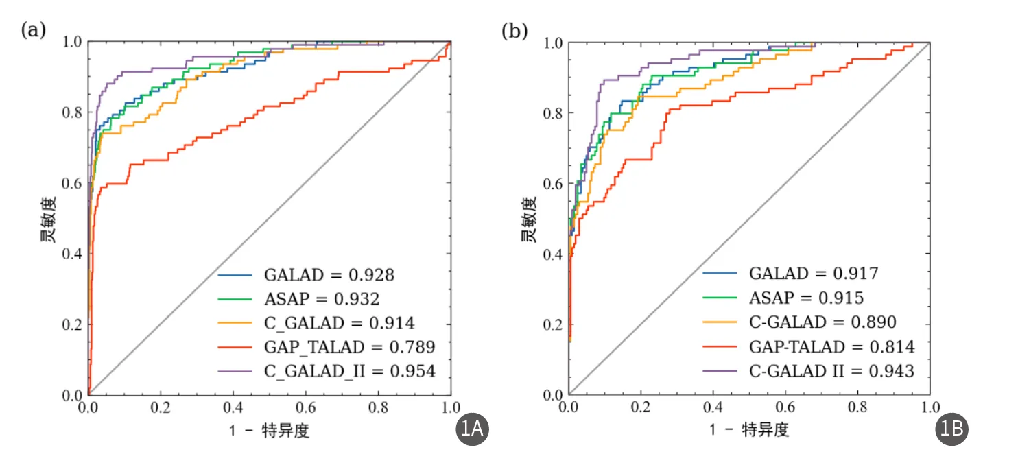 在測試集上驗(yàn)證C-GALAD Ⅱ所得AUC為 0.954,敏感度為88.04%,特異度為94.85%;在外部獨(dú)立驗(yàn)證集的C-GALAD Ⅱ所得AUC為0.943,敏感度為89.29%,特異度為90.2%,性能優(yōu)于其他已發(fā)表模型。