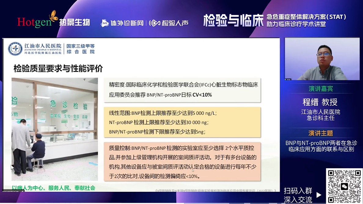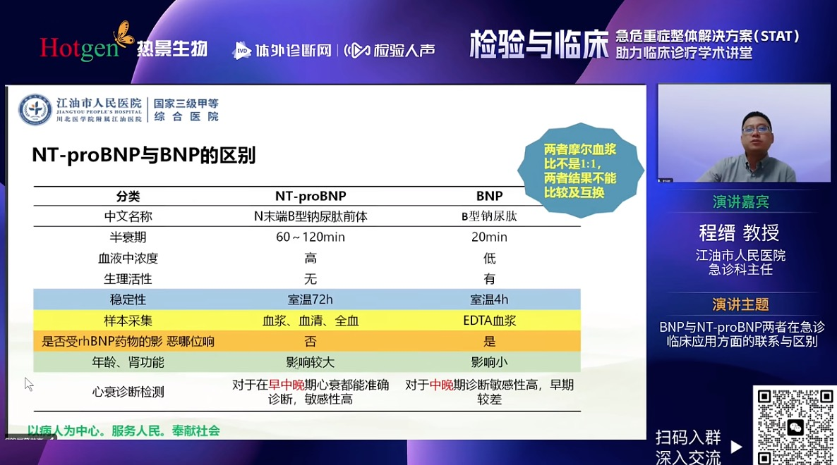 四川省江油市人民醫(yī)院急診科程縉教授就BNP與NT-proBNP兩個(gè)指標(biāo)進(jìn)行了深入剖析,從BNP與NT-proBNP病理生理機(jī)制出發(fā),解析了BNP和NT-proBNP之間的區(qū)別,全面的闡述了影響B(tài)NP和NT-proBNP水平的因素,又從檢驗(yàn)角度強(qiáng)調(diào)BNP/NT-proBNP質(zhì)量要求和性能評(píng)價(jià)。最后程教授回歸臨床分享BNP/NT-proBNP在心衰早期篩查與一級(jí)預(yù)防、心衰的診斷與鑒別診斷和心衰治療監(jiān)測(cè)和預(yù)后評(píng)估等臨床價(jià)值。