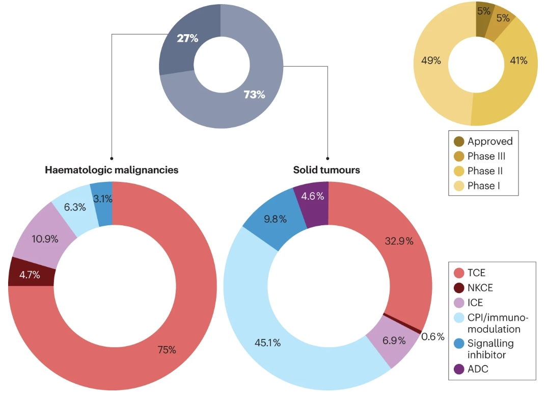 目前,有300多項(xiàng)臨床試驗(yàn)涉及200多種不同的雙特異性抗體分子,其中約75%用于治療實(shí)體瘤,25%用于治療血液系統(tǒng)惡性腫瘤。有10種bsAb藥物已被批準(zhǔn)用于癌癥治療,其中9種在美國和/或歐洲獲得批準(zhǔn),cadonilimab在中國獲得批準(zhǔn)。到目前為止,臨床中開發(fā)的很大一部分bsAbs已經(jīng)處于后期階段(II期和III期)。另外,可以發(fā)現(xiàn),治療實(shí)體瘤的bsAbs主要由免疫調(diào)節(jié)劑主導(dǎo),包括雙CPI(約45%)和TCE(約33%),其次是靶向雙途徑、ICEs和ADC的bsAb。
