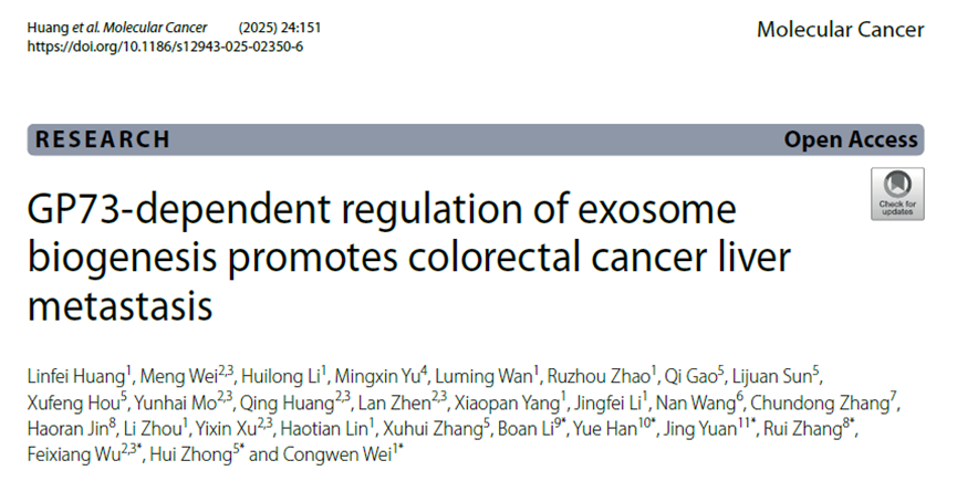 近日,北京堯景基因技術(shù)有限公司鐘輝研究員聯(lián)合廣西醫(yī)科大學(xué)附屬腫瘤醫(yī)院吳飛翔主任醫(yī)師、軍事醫(yī)學(xué)研究院魏從文研究員、遼寧省腫瘤醫(yī)院張睿主任醫(yī)師、首都兒科研究所袁靜教授等團(tuán)隊(duì)在Molecular Cancer(影響因子27.7)雜志上發(fā)表題為“GP73-dependent regulation of exosome biogenesis promotes colorectal cancer liver metastasis”的重磅文章。