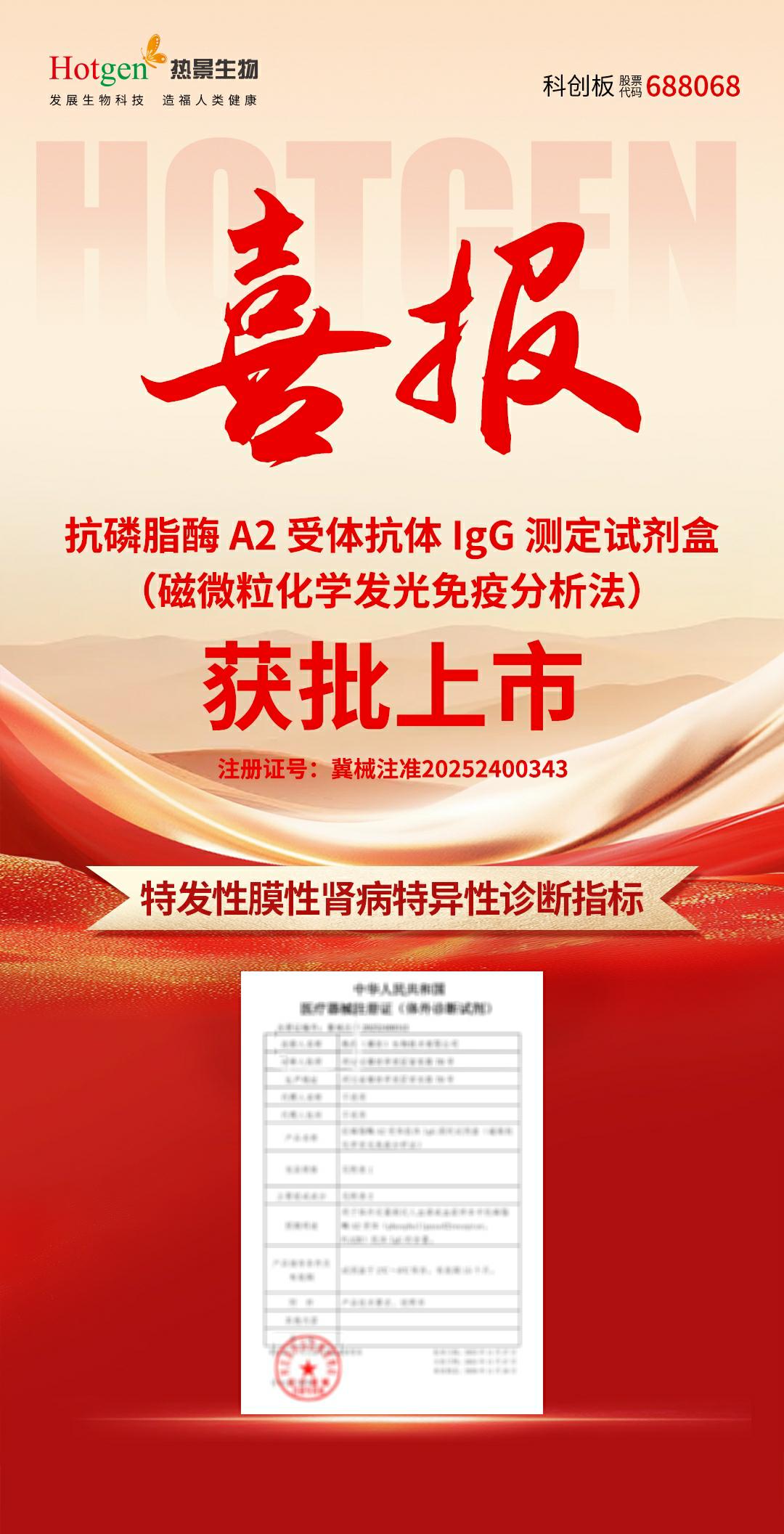 近期北京熱景生物憑借深厚的研發(fā)積淀與技術(shù)創(chuàng)新實力,成功斬獲一項新的醫(yī)療器械注冊證 ——抗磷脂酶 A2 受體抗體 IgG 測定試劑盒(磁微?;瘜W發(fā)光免疫分析法)正式通過河北省藥品監(jiān)督管理局批準!這一突破豐富了熱景生物在腎病診斷領域的產(chǎn)品矩陣,為臨床診療提供更為高效的檢測方案,進一步引領膜性腎病精準檢驗。