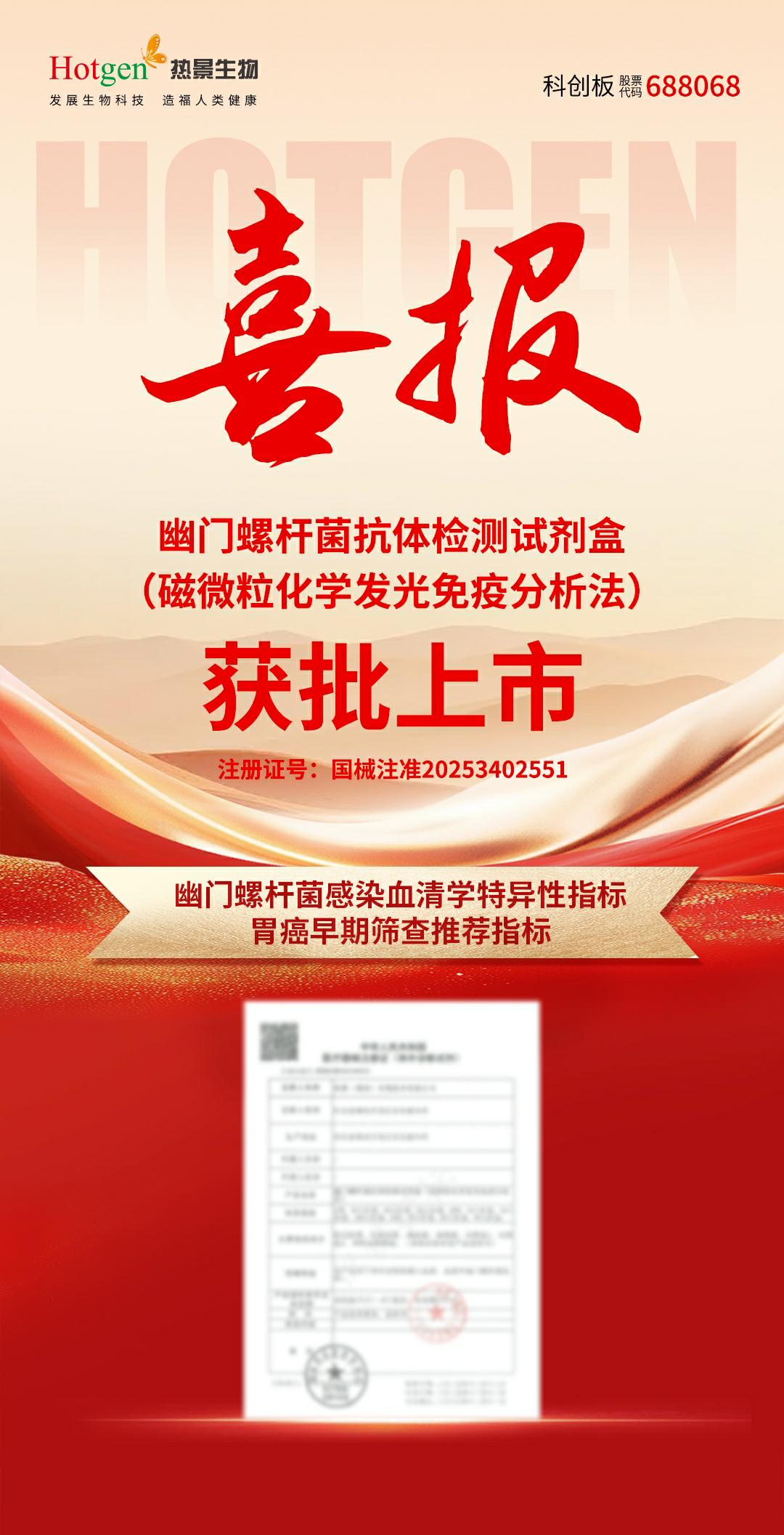 近期,北京熱景生物憑借深厚的研發(fā)積淀與技術(shù)創(chuàng)新實(shí)力,成功斬獲一項(xiàng)新的醫(yī)療器械注冊(cè)證——幽門螺桿菌抗體檢測(cè)試劑盒(磁微?;瘜W(xué)發(fā)光免疫分析法)正式通過國(guó)家藥品監(jiān)督管理局批準(zhǔn)!這是繼胃蛋白酶原Ⅰ(PGⅠ)、胃蛋白酶原Ⅱ(PG Ⅱ)和胃泌素17(G17)后的第四個(gè)胃功能檢測(cè)項(xiàng)目,豐富了熱景生物在胃病管理領(lǐng)域的產(chǎn)品矩陣,為臨床診療提供更精準(zhǔn)的解決方案,為胃癌早期篩查提供更全的有效依據(jù)。
